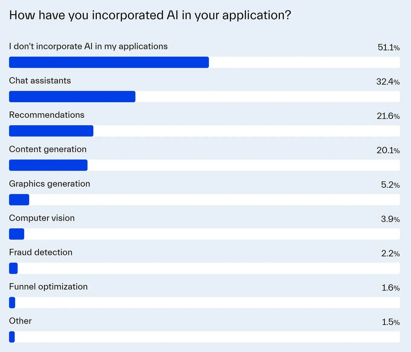 In terms of how developers incorporate AI in their applications, the top three most common use cases include chat assistants (32.4%), recommendations (21.6%), and content generation (20.1%).