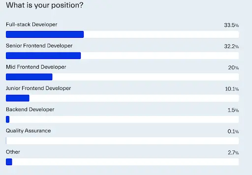 Out of the 6,028 programmers we surveyed in our 2024 SOFE report, only 10.1% identified as a junior frontend developer, while over 50% called themselves either senior or mid. The introduction of AI has definitely changed how developers work, as a lot of simple tasks that were previously handled by juniors became fully automated. However, this doesn’t mean that AI will replace juniors.