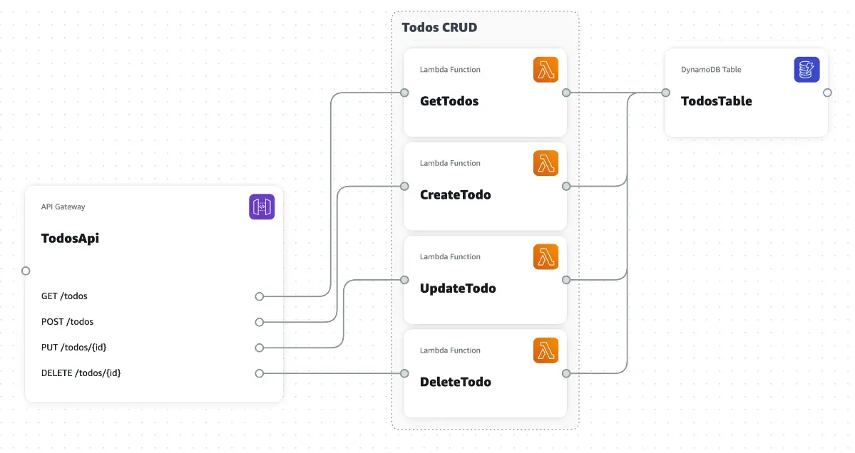Other than exposing REST API and processing data, you also need some kind of database. Amazon DynamoDB should do the job just fine. Here is an example infrastructure design for a to-do REST API built in AWS Application Composer: