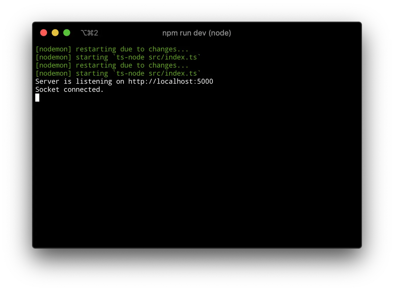 After page refresh, you should notice a message: “Socket connected” in our terminal.