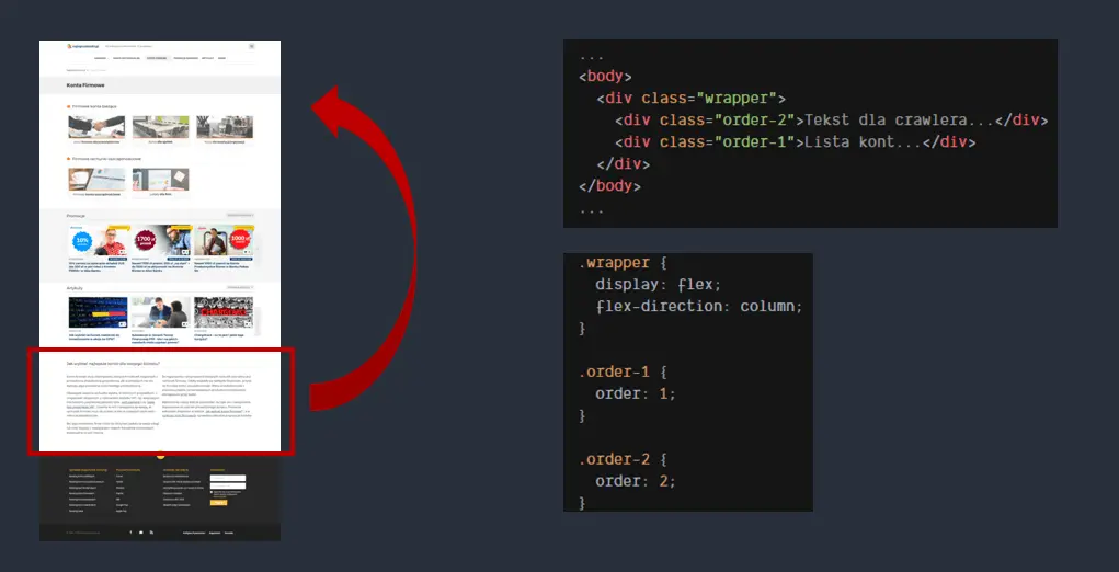 – in the example below, the user could see a piece of text at the bottom of the page, but it was visible for the search bot right at the very start of the page.