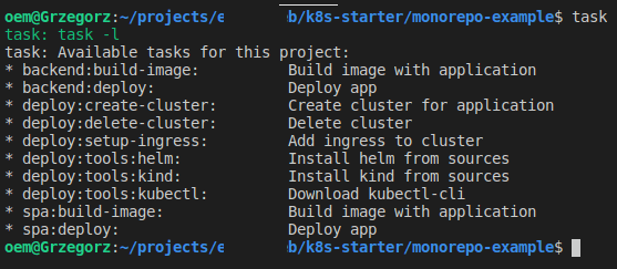 Taskfile has a built-in flag -l that delivers the list. It’s worth setting it as a “default” action. Remember – Taskfile only lists commands which have a description.