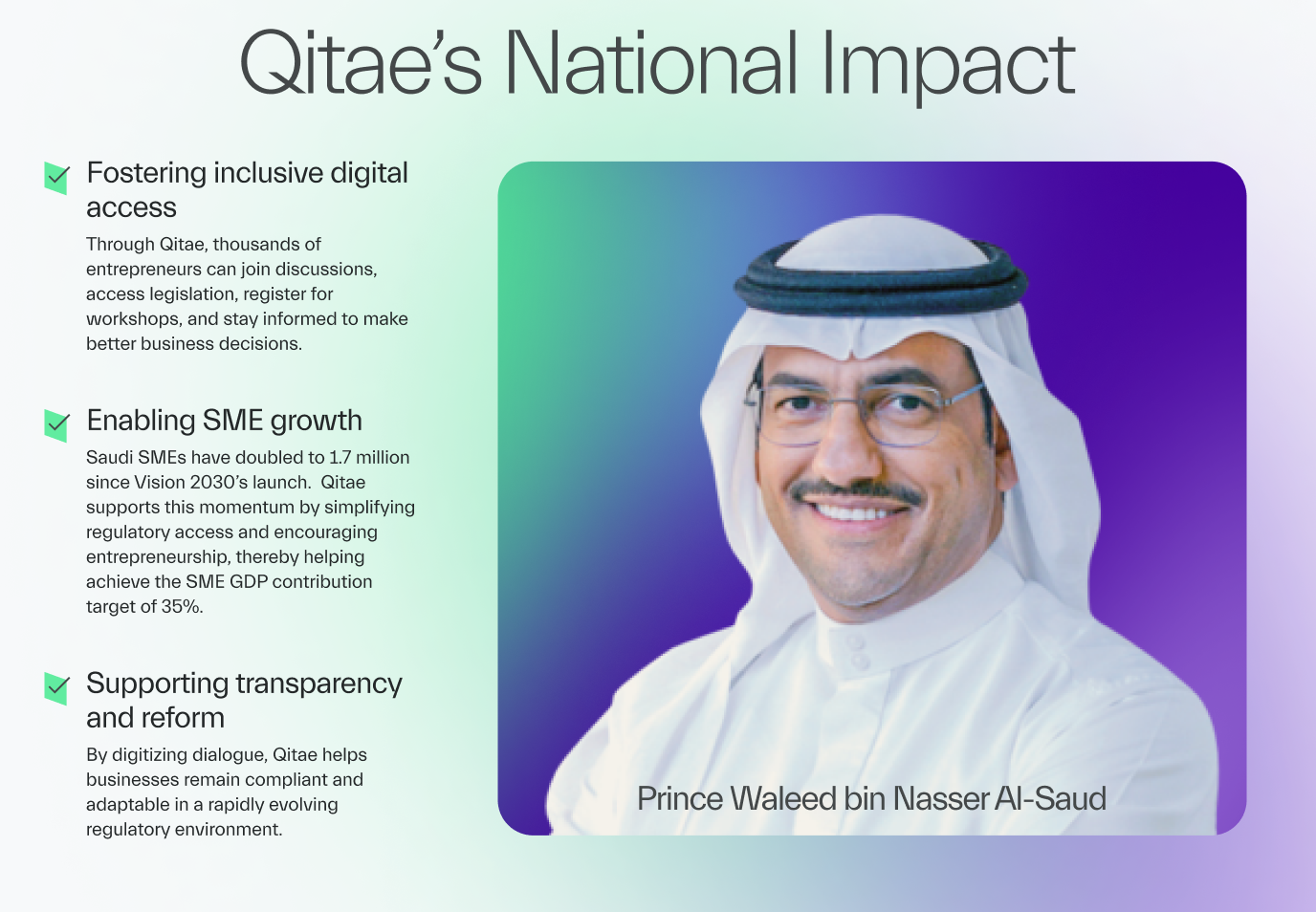 As Saudi Arabia advances its Vision 2030 agenda, Mumken, a company of Prince Waleed bin Nasser Al-Saud, set out to support the private sector in making informed business decisions by analyzing all relevant updates, transforming information into actionable insights, and clearly explaining their impact through the Qitae app.
